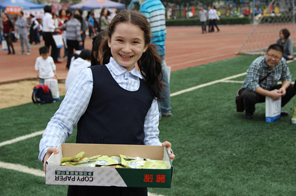 下午4:00整,优美的音乐飘荡在整个校园,碧绿的足球场上早已搭好了三十几个帐篷,热情的学生们、热心的家长们在老师们的引导下都早已等候在各自的“摊位”上了。顿时,操场成为了聚集爱心的大卖场。瞧,各个摊位布置别具一格,醒目的标语充分体现每个班级的热诚;商品都是同学们与家长一起精心准备好的,有可爱的公仔,有好看的书籍,有精美的小摆设,更有爱心家长们亲手做成的一盒盒精致的蛋糕,一碗碗甜滋滋的汤水,还有那香味扑鼻的肉丸。在义卖现场还有狮子会的工作人员正在收集家长们送来的棉衣、棉被。校园里处处是欢声笑语,处处是爱心的暖流涌动。一位妈妈把熬制一上午的猪脚姜也带来了,她说,自己做这个最拿手,所以就想到与大家一起分享这些了。一位爷爷把自己珍藏的书法作品也拿来了,他说,这活动太有意义了,他说很值得。孩子们也跟着老师和家长大大方方地叫卖起来,那甜甜的微笑真叫人喜欢!这冬日的暖阳不仅温暖着每一寸土地,更温暖着每一个热情的人。一个小时的义卖很快就接近尾声了,孩子们在老师的带领下有序地整理着本班的物品,一部分学生自觉地清扫着垃圾,这个操场只看见绿茵茵的颜色,却看不到一点纸屑,这不得不让人肃然起敬!是的,我们的孩子在奉献爱心的同时,更展示出花城学子爱护环境的良好形象,这是多么让人欣慰的一幕啊!