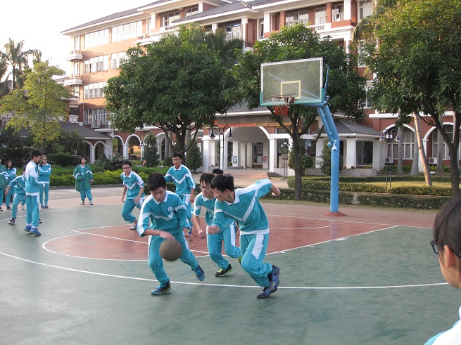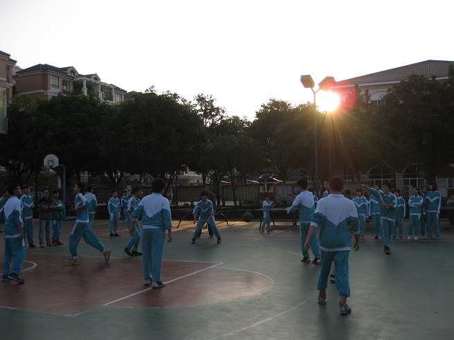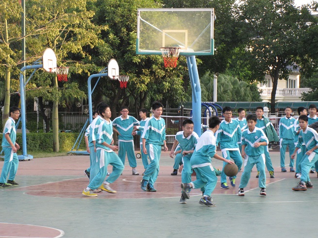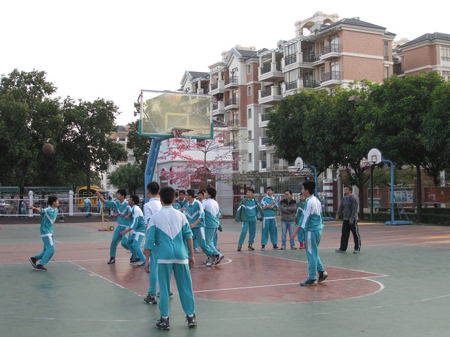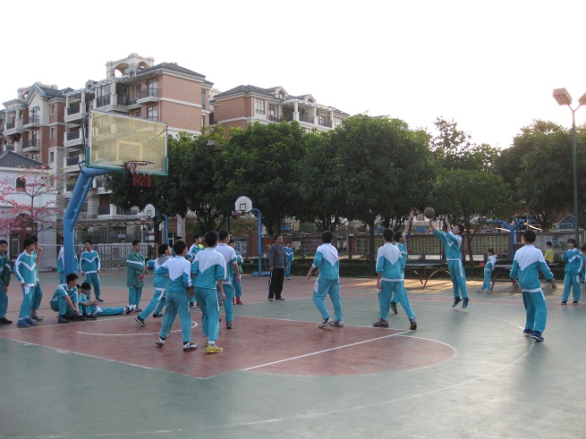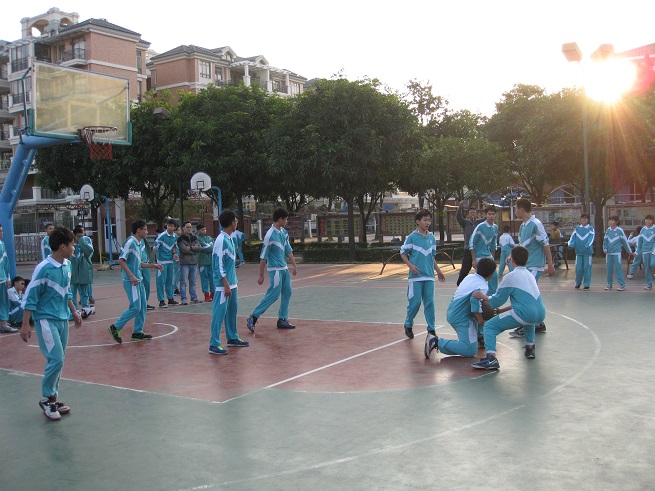 赛前,八年级全体师生高高兴兴地来到篮球场,球场上顿时欢声笑语,一片欢乐,完全没有大赛将至的紧张气氛。