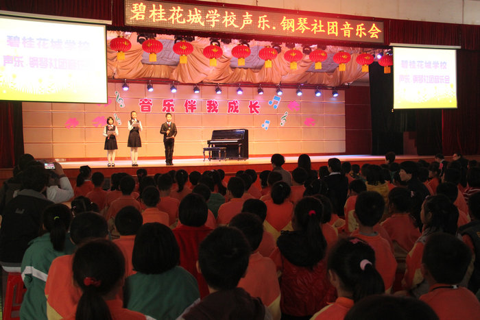 当秋风将树叶从树梢上一片一片扫落下来的时候,冬天的身影也不知不觉地来到了这个世界。人们严严地关了门窗,将彻骨的寒冷挡在房门之外。可是不甘寂寞的花城学子正在紧张有序的忙碌着;11月29日下午,碧桂花城学校综合馆二楼座无虚席,碧桂花城学校2013声乐、钢琴社团音乐会在这里如期举行,此次音乐会由我校音乐组老师策划准备,每位学生都精心准备了自己的曲目,《小小少年》、《童年的回忆》、《妈妈格桑拉》、《乘着歌声的翅膀》、《最初的梦想》……一首首经典的声乐、钢琴曲在舞台上空回荡,让人仿佛置身于维也纳金色大厅,欣赏着高雅的音乐,不仅让在场的家长和孩子们看到了花城学子的优异表现,更让在场的每一位观众真切感受到了声乐、钢琴艺术的魅力。
