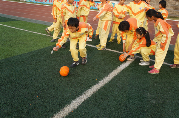 孩子们最喜爱的游戏要算南瓜赛跑了。比赛者用一把小勺推着南瓜跑,先到终点者获奖。