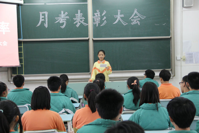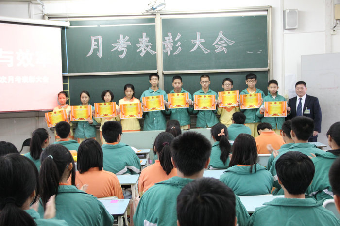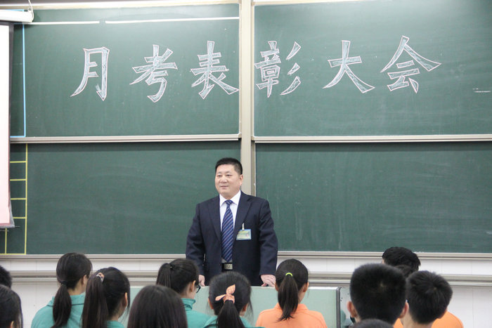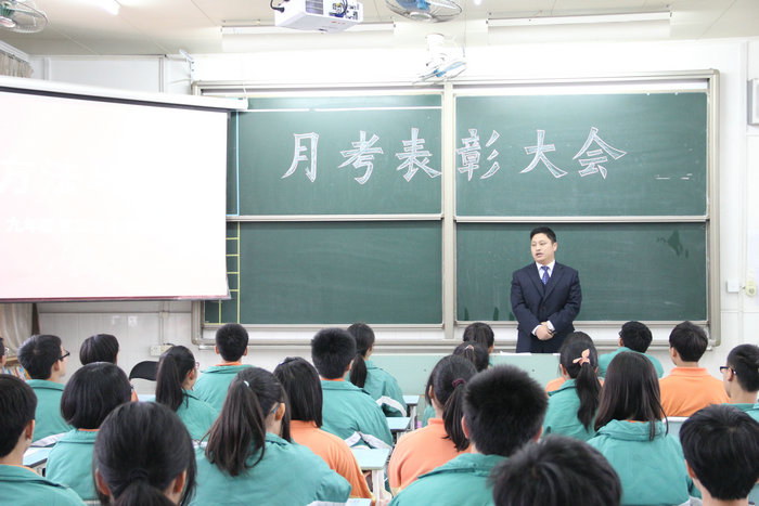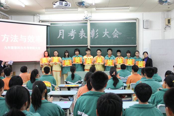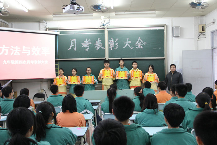 12月13日下午第七节课,九年级全体师生在九(1)班教室召开了本学期第四次月考总结表彰大会。本次会议主题为“方法与效率”,由九年级级长吉正军老师主持,谭加文校长助理出席会议并作了重要讲话。