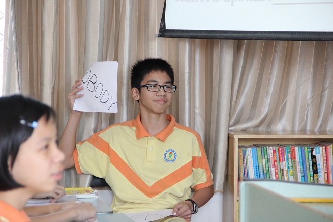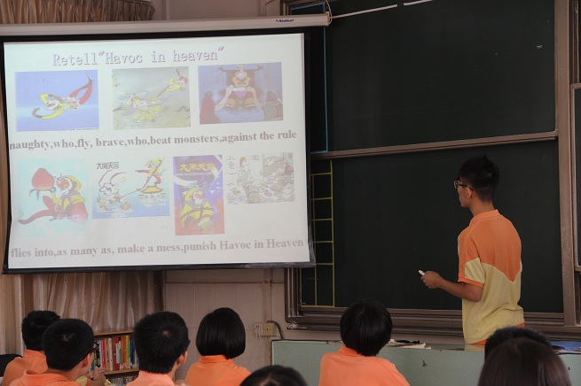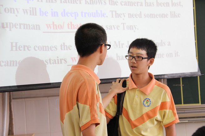 在简短的问候后,Miss 胡与同学们讨论了卡通的分类,然后以一段由不同卡通电影剪辑成的视频引出了对模块课文内容的复习。为保证复习效率,miss胡采取了小组讨论,个体思考填空,看图复述等多种习题形式。同学们表现得积极且高效。接下来的课堂充满了欢声笑语,在Free Talk中同学们滔滔不绝;在Show Time的环节里同学表演夸张,语音语调丰富准确;在Guessing Game时参赛者热情主动,同学们句型使用准确到位。最后,Miss胡又引导同学们静下心来回归到初三的备考中,用中考链接中精选的习题完整的总结了本模块的学习重点。