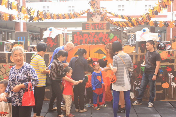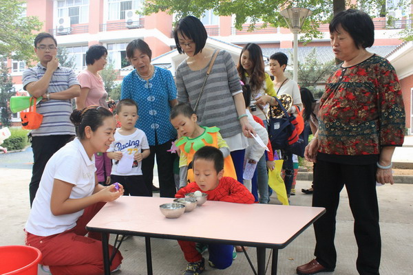 10月30日上午,万圣节装扮秀开始了,孩子和老师们都穿上了节日的盛装,有魔鬼、仙女、超人、巫婆等应有尽有。讨糖环节最受孩子们欢迎,幼儿园每个楼层都可以看见孩子们穿梭的身影,耳边不断传来《Trick or Treat》的歌声。有些班级的“咬苹果”游戏可有新意了,用竹竿把苹果吊起来增加了难度,孩子们非常兴奋,乐此不疲。中午孩子们享受了美味丰盛的自助餐,小肚子吃的圆鼓鼓的。下午,孩子们还邀请了爸爸妈妈、爷爷奶奶到幼儿园参加游园活动。今年我们设立了34个摊位,让孩子自由选择玩,设立兑奖环节,让孩子自己去兑奖领奖,培养孩子独立自主的品质。幼儿园里热闹沸腾,欢笑声、歌唱声、呐喊声,汇聚成一个欢乐的海洋。