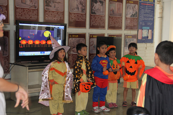 五(1)班演唱的歌曲节奏感强,歌词多,但是他们演唱得很清楚很熟练。四(1)班一首This is Halloween, 恐怖的音乐,迅速地给我们带来毛骨悚然的感觉。三(1)班一首可爱的儿歌又给了我们清新的感觉,其他班的小朋友也不自觉地跟着唱起来。二(1)班Five Little Pumpkins,边唱边做动作演绎歌词的意思,歌词是押韵的英文句子,小朋友表演起来节奏感十足,尤其五个扮演小南瓜灯的同学表现得特别出众!最后出场的是一(1)班,老师巧妙的把两首有趣的万圣节歌曲结合在一起,展现了万圣节小朋友们盛装去要糖果的场面,伴着第二首音乐,孩子们绕着全场边走边做出各种恐怖的动作,引出了全场的一片欢呼声,将整个活动推上高潮。