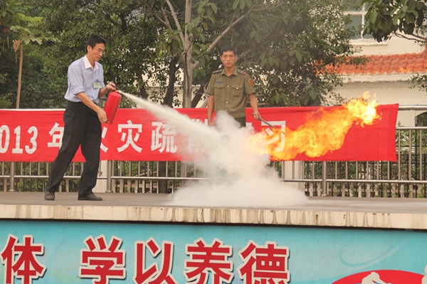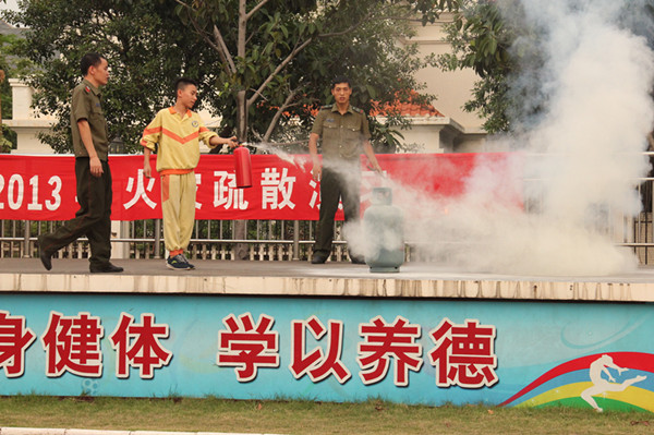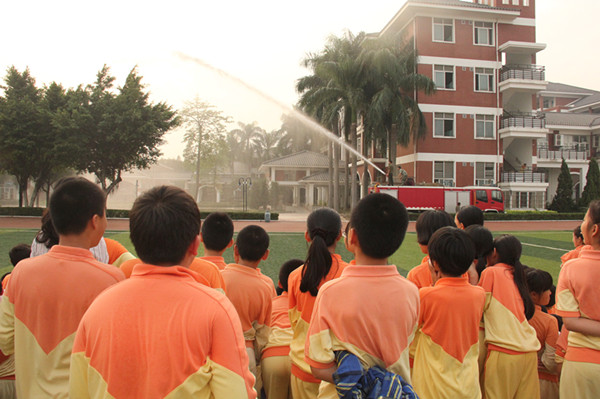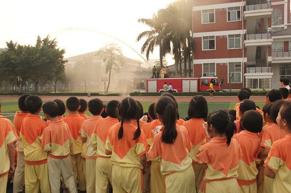 接着,陈村消防中队警官给大家讲话,教育学生们要增强预防火灾的意识,了解日常生活中防火灭火知识,掌握火灾发生时逃生的基本技能。他的讲话迎来了同学们热烈的掌声。陈村消防官兵们还为同学们演示了如何使用灭火器。少数同学在警官的指导下也参与了使用灭火器灭火。最后,官兵们给大家表演了高空灭火,只见消防车上的水管喷出高达10几米的水柱,操场上又爆发出一阵阵热烈的掌声。