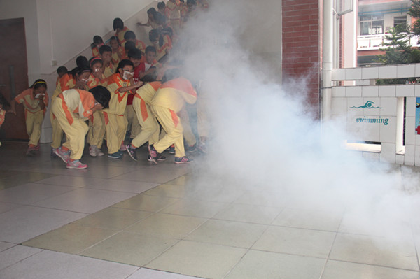 我校对学生安全自救教育非常重视, 11月9号是全国“安全消防日”。上周五,我校举行了“火灾疏散演习”。下午4:20,广播响起了,大家听到“火灾疏散演习现在开始”的口令,学生迅速离开教室,沿预定路线迅速撤离到足球场。大家都用湿毛巾捂住口鼻,弯着腰,快步疾行,不到2分12秒,全校师生都安全到达指定位置。