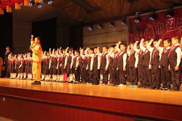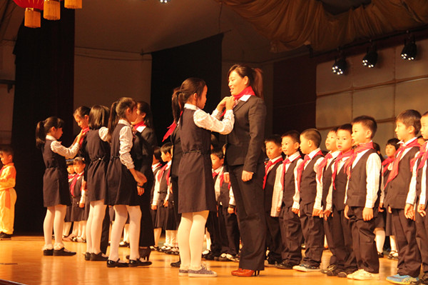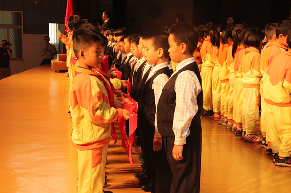 踏着欢快的乐曲,一年级新队员们依次来到舞台中央,一张张可爱的笑脸是那么甜美灿烂。之后,三年级老队员们捧着鲜艳的红领巾也来到了舞台上,他们细心地给孩子们戴上了崭新的红领巾,看着胸前的红领巾,新队员们更自信了。他们举起右臂,在少先队大队长的带领下庄严宣誓,那铿锵有力的声音响彻会场,家长们没忘记记录这个难忘的时刻,纷纷举起了手中的相机,拍下这珍贵的镜头。
