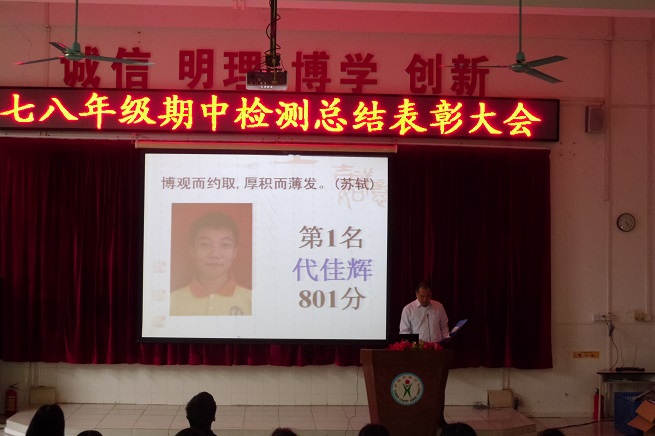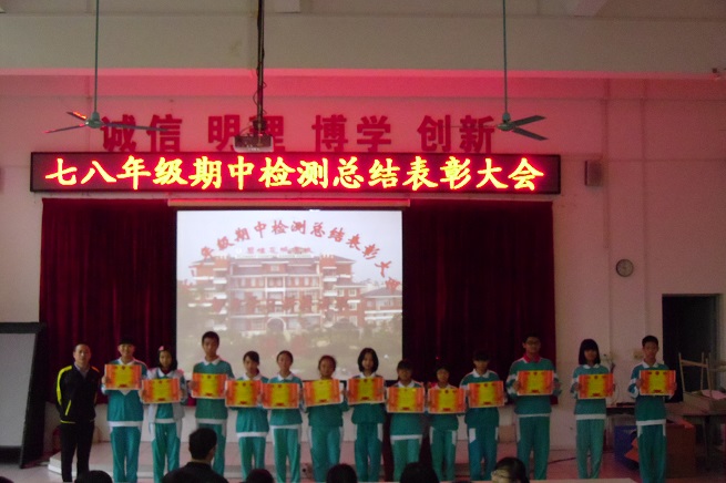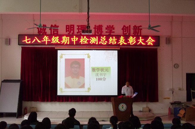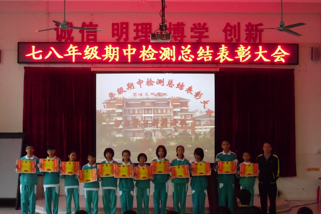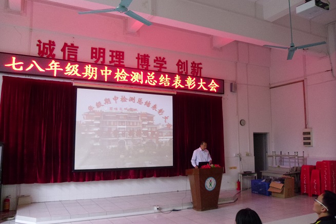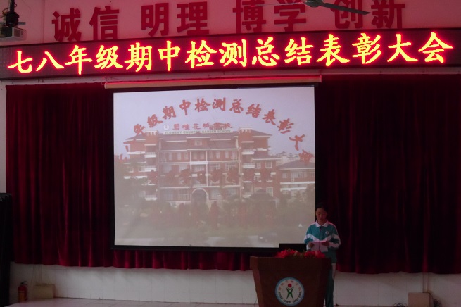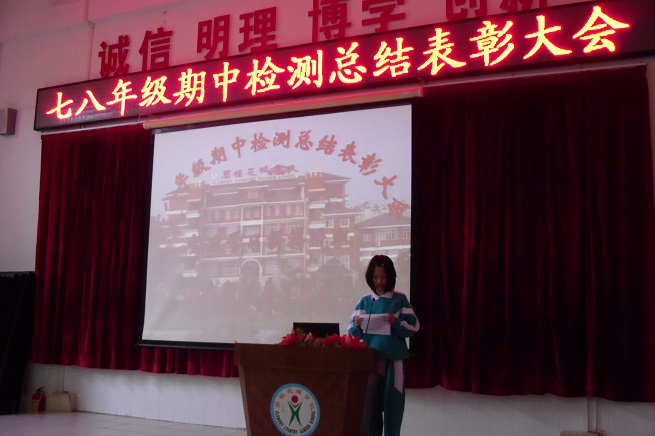 11月14日下午4点,七、八年级全体师生在学校阶梯教室召开了期中总结表彰大会,会议由七、八年级副级长欧阳晃增老师主持。