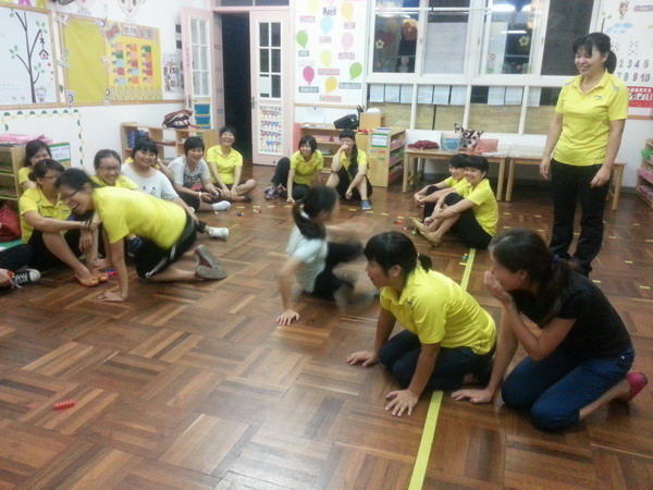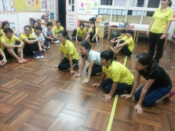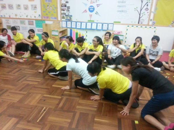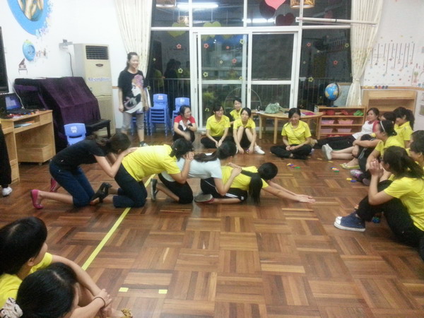 2013年10月14日晚,像往常一样,老师们又相聚在一起。本次培训的内容是“奥尔夫音乐”,由外出学习的几位骨干老师进行培训和分享。活动中,一首节奏欢快的乐曲把我们带入美妙的音乐课堂,老师们在动听的音乐声中进行声势律动练习,生动有趣,让老师们忘却白天的疲惫,忘我的投入其中!在“找朋友”的环节中,老师角色扮演成“人”和“狗”,我们角色互换,体验了狗与人和睦相处的温馨画面,以及音乐游戏的乐趣……