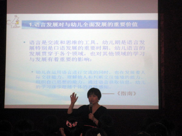 “大大的犀牛小眼睛,小小的蜻蜓大眼睛”,在报告会现场,马老师把300名教师当成幼儿园的小朋友,合着拍子,有节奏地学起儿歌来,让老师们亲身感受语言学习的魅力。马老师还通过讲故事、个案分析等,深入浅出地详解《指南》里幼儿语言学习与发展的目标框架及要求,幼儿口头语言学习发展的目标要求,幼儿早期书面语言的目标要求,《指南》精神指导下的语言教学活动实践等内容。马灵雁老师最后希望老师们能学有所思、学有所得、学以致用。