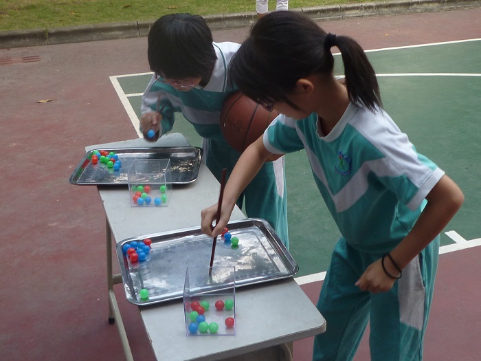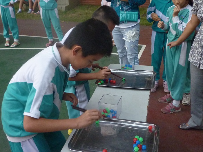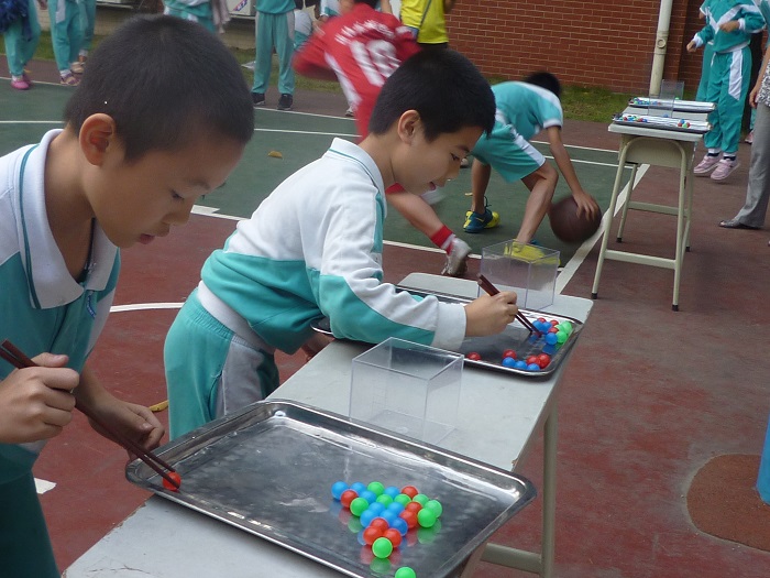 先见到四个班的同学各排成一条队伍,随着谭老师一声令下,比赛正式开始!每个同学拍着篮球,奔向比赛的桌子,用筷子将盘子内的一个小球夹入正方体盒子内,再运球返回,把球交给第二个同学,如此类推。现场欢呼声和加油声交织一片,老师和同学们都在享受着这场比赛。