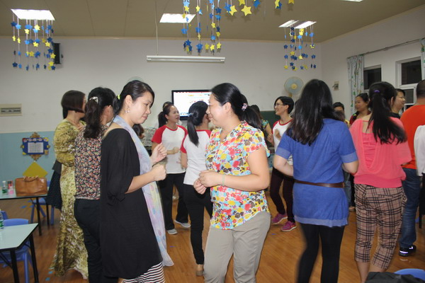 1.跳握手舞,在老师的引导下,家长们随音乐拍手、转圈,听到提示的音乐时,就找身边的一位家长握手,而且每一次,都要跟一个不同的家长握手,一时间,家长们都兴奋了,认识的不认识的,男的女的,都握起手来,在欢快的音乐衬托下,你我之间都在不经意间拉近了距离。