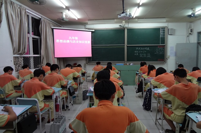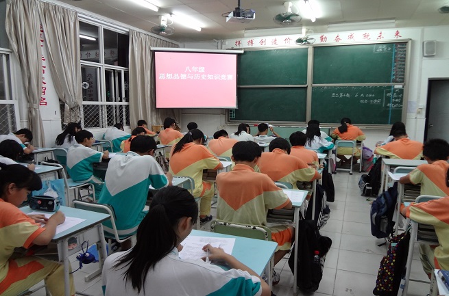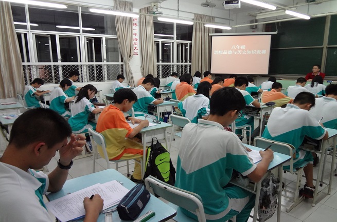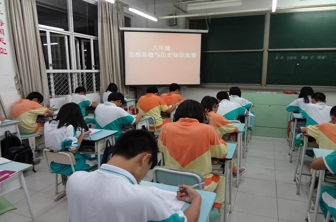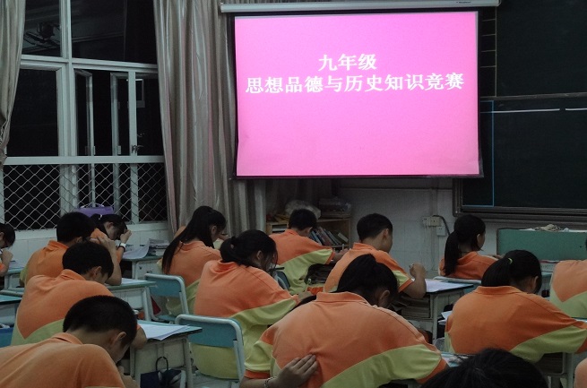 本次竞赛得到了教学处、年级组、学科组的大力支持,特别是思想品德与历史两位老师从出题、监考、改卷、评奖等各方面进行了周密部署。竞赛采取闭卷方式,两科各50分,满分100分。试卷都是摘自近年来全国各地中考原题,甚至很多就是佛山中考试题,赛场上学生们个个精神饱满、审题细致入微,既赛出了风格,又赛出了水平。