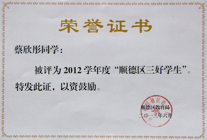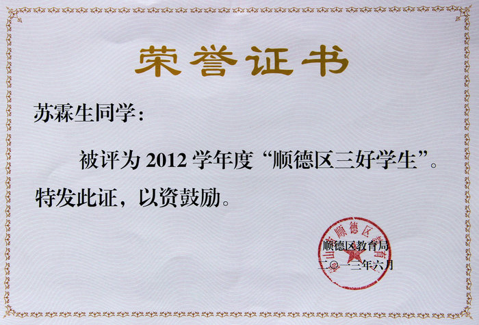 热烈祝贺我校蔡欣彤、苏霖生两位同学被评为2012学年度“顺德区三好学生”!