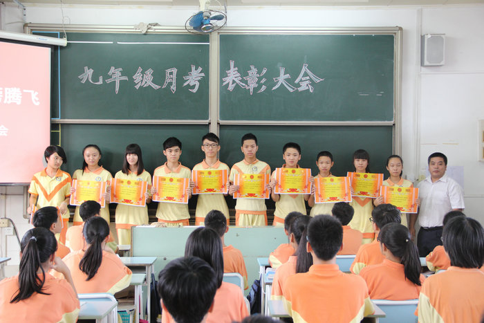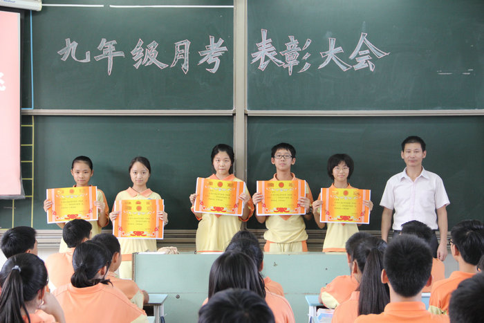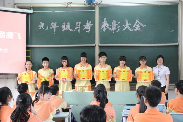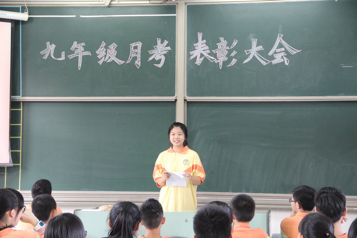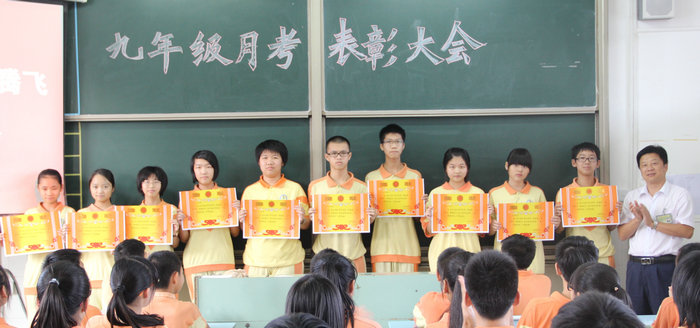 这次月考中,王悦秋等20名同学总分名列前茅,彭易非等5名同学分别夺得各学科第一名,张勉等七名同学取得很大进步。在热烈的掌声中,老师们为他们一一颁奖,并祝愿他们再接再厉!学生代表王悦秋同学结合自身体会谈了学习方法,最后她讲到:虽然初三这一年是辛苦的,但是我坚信:2014年的7月,当我们收到崭新的高中录取通知书时,一切的苦难都会变成甜蜜的笑容。