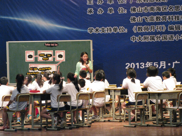 龚主任如是说:“英语是一门语言,学习它时过于强调它的读音和功能是不符合人类语言学习的过程的。”是啊,我们何尝见过一个妈妈教孩子的时候会说:“这是杯子,跟我说杯子。现在一起来读三次:杯子,杯子,杯子。横、竖、撇、捺、横、撇、捺、竖,杯;横折竖弯钩、横,子。杯子是名词,一个杯子,这是一个杯子。” 给孩子传授新知识点的时候不夸张,不用它来做chant, 也不用它来唱歌,只会在不同的背景下不断的对它加以运用,自然而然的,杯子这个词就知道了,孩子要用的时候也自然会用了。英语学习也应该如是,不用老师们做出一堆的课件,在几十张PPT的牵引下一步步的将这个词语会读,在This is a cup.这样的句型中会说,会写;而是在和孩子们不断的聊天、不断运用一些看似他们完全不懂的词汇、句子,在不断的运用和实践中,孩子们自然就会了。最为欣赏的是龚主任,这个从来都没教过低段的小孩子,只教过高中生的教授,在二年级孩子们的课堂上用他的个人魅力,用他上课时的那种轻松惬意的感觉,使孩子们在他的课堂上愿说、悦说,尤其在下课那一会的功夫中,龚主任很是诚恳的对课堂上或说话很积极,或表现很羞涩的孩子提出自己的表扬和期望时,孩子们那发自内心的愉悦笑容让在座的各位老师情不自禁地鼓起掌来。
