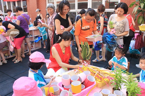 活动开始,由大家推选出来的超市经理们讲话了,他们在激励自己的“员工”,要以最热情的服务迎接每一位顾客。在铿锵有力的音乐声中,工作人员精神抖擞地入场了,迎宾员、宣传员、服务员、安检员、收银员等,都站在各自的工作岗位上,开始了今天的服务工作。只见工作人员刚到位,早已等不及的顾客们迅速涌进超市,唯恐买不到自己喜欢的物品,一下子,爱心超市里人山人海,那情景可谓壮观呀!食品区、图书区、玩具区、家具装饰区都挤的满满的。在食品区,除了有新鲜的蔬菜、水果、饮品、糕点外,还有中三班的一位家长开的爆米花专柜,她把自家的爆米花机拿过来,现场制作爆米花,可受欢迎了!这边图书区里还有现场制作书签的服务员呢,真贴心呀!玩具柜的工作人员在热情地推销自己的物品。再看看中四班的家具装饰区,更是挤满了顾客,在这里,有家长们亲手制作的DIY头箍、发夹等,色彩搭配亮丽,款式新颖、实用,有的顾客一买就是好几个,不一会儿功夫,这些头箍、发夹全卖完了,特别抢手!还有唐擎宇小朋友的家长提供的精美小盆栽,为了使它卖上更好的价钱,小服务员们在义工朱芷慧妈妈的指导下,现场制作花盆套,她们将废旧的大纸巾芯用瓦楞纸包装后,粘上漂亮的装饰,将小盆栽放进去,显得更加美观了!另外,还有很多家长提供的字画、挂钩、小背包、相框、香囊等也很受欢迎。