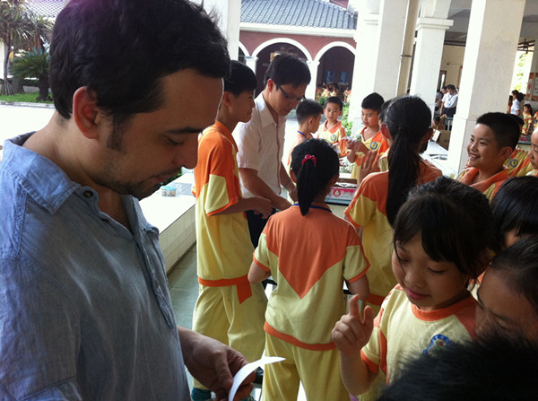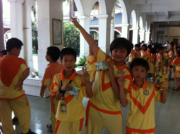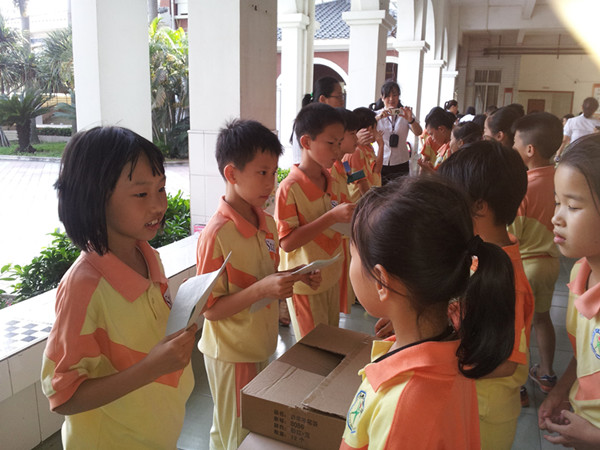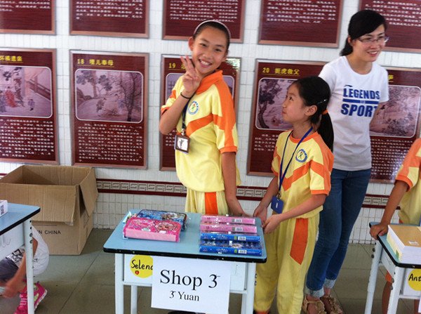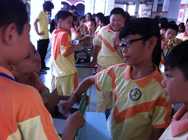 5月31日下午4:10―4:50,碧桂花城学校全体师生欢聚一堂,在楼下大厅举行“快乐六一英语超市”的大型室外露天游园活动。今年与往年“六一”游园活动有所不同的是,我们设置了货币区和商品区。在货币区,孩子可以通过英语口语对话来获得一元到十元不等的奖金,问题的难度系数越高,奖金数额则越高。同学们可以根据自己的情况自由选择问题难度。