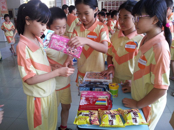 在商品区,我们按照商品价格的不同,将所有的商品进行了分类摆放,同学们都能根据自己的需要选择自己需要的“六一”礼物,同学们个个都是满载而归。