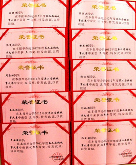 《小学生拼音报》是全国汉语拼音教学研究会会报,由全国汉语拼音教学研究会和人民教育出版社小学生语文编辑室合办,先后荣获全国首届少儿报刊评比栏目一等奖、全国低幼报刊编校质量评比第一名、首届全国教辅报纸编校质量评比一等奖,国家教育部审定通过的九年义务教育人教版小学语文教材配套读物。我校在参加《小学生拼音报社》举办的2012年度小学生阅读能力大赛中荣获组织奖;在2012年度第二届编故事大赛中,区颖诗同学荣获一等奖,梁俊滨同学荣获二等奖,王浩源、周嘉琳、杨佳仪、黄思雅、张楚颖等同学荣获三等奖,罗安瞳、彭琳雅、高俊峰、冯文姿等同学获得了优秀奖。(文/图:黄洪)