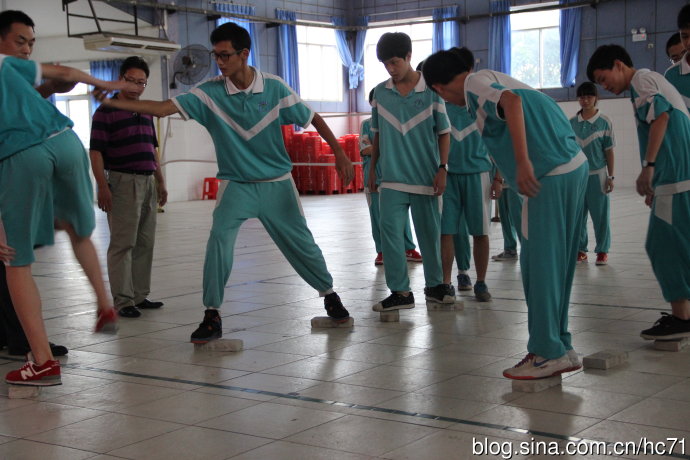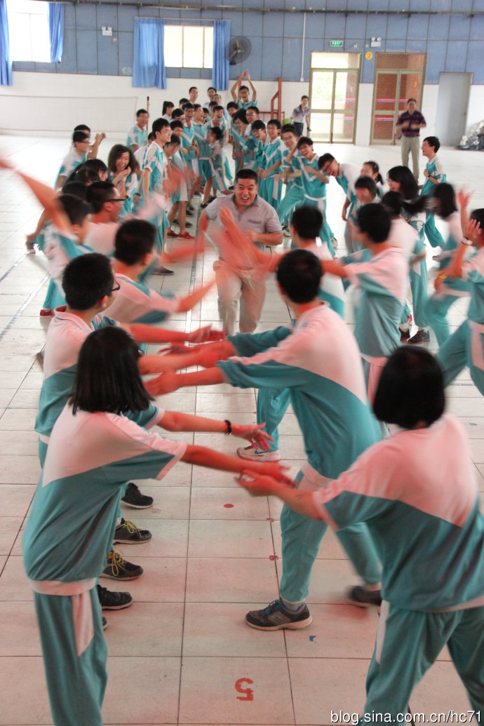 接下来就是游戏环节,九年级全体师生一起互动,先后参与了“兔子舞”、“乌龟乌鸦”、“小鸟鸟巢”、“过刀山”、“过河”等游戏。其中最为感人的是“兔子舞”环节,大家手搭肩膀围成一圈,老师穿插其中,随着音乐一起跳动,其乐融融;最为精彩的是“过刀山”环节,老师的参与让现场气氛high翻天,笑声不断;最为紧张的是“过河”环节,即四人一组,分别靠五块砖头通过一条宽宽的河,男生女生齐上阵,通力合作往前行。