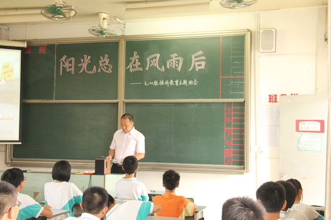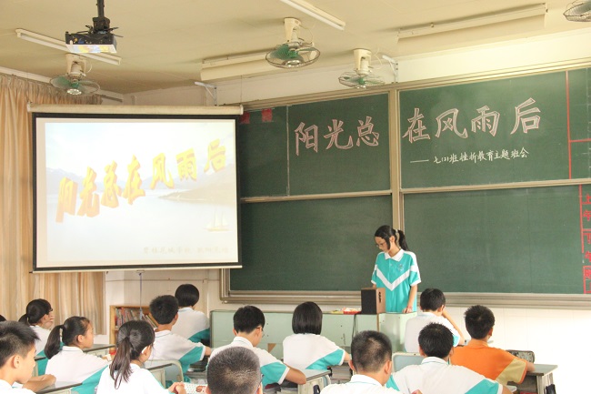 6月13日上午,七(2)班班主任欧阳晃增老师在七(2)班展示了《阳光总在风雨后》主题班会示范课,这节课内容丰富,形式多样,获得了现场师生的好评。