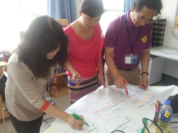 三天的学习,我越来越意识到,通过活动演练过的教学部分,都是印象深刻的。在碧桂花城学校国际班的墙壁上,张贴了许多有关10大培养目标和12大态度的图片,这些图片几乎是处处可见的,老师巴不得将厕所都贴满,同时我们老师在课堂里也会反复跟孩子们讲述什么是10大培养目标,什么样的人才是具有12大态度的!但是我们发现,我们没有将这些美丽的图片和孩子们的生活真正地联系在一起。在苏州的课堂里,老师让我们以小组表演的方式将12种态度的意义展示出来,集体的智慧是无限的,经过表演诠释过的12种态度是能和我们的生活联系在一起的,这些知识的获得是给人印象深刻的。反思我自己的课堂,我也可以让我们的孩子来表演这10大培养目标,12大态度,他们也会用他们的语言,以及他们自己的生活经历来诠释,这些都是老师们无法代替的。