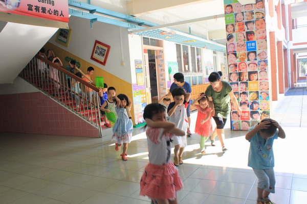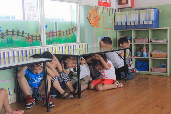 “呜――呜――”急促的警报声响起,师生立即停止所有活动,各楼层老师迅速指挥幼儿有序的跑出教室,只见孩子们一个个猫着腰抱着头,沿着墙角按照指定逃生线路快速地往安全场地跑去,并迅速按班级集合站好,随后班主任快速清点幼儿人数,及时上报给了现场指挥。经核准全部幼儿到达安全地带,只用了3分钟,整个过程紧张有序,收到了预期效果。