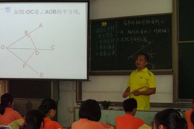 欧阳晃增老师在七(1)班执教了《简单的轴对称图形(3)》一课。这节课贯彻了“以学生发展为本”的教学思想,以学习者为中心,创设轻松、愉快的教学环境,提供自主探究的机会,学生亲身参与“角平分线性质的形成与问题解决”的过程,增强了学生的主体意识。教师优化教材内容,精心设计例题和随堂练习,教法适宜,多种教学方法有机结合,既有“启发式”、“讲授法”的教学方法,又有“活动及探究式”教学法,展现了“探索――归纳――猜想――证明――应用”的完整过程。整节课以生为本,由浅入深,环环紧扣,在轻松愉悦的氛围中高效地完成了所有的教学任务,进一步培养了学生自我解决问题的能力。