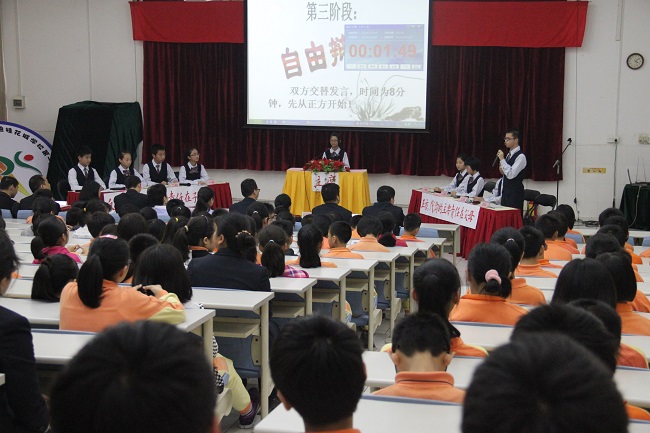 四月三号星期三下午三点半,碧桂花城学校迎来了第三届“激辩青春,和谐校园”中学生辩论赛决赛。本次决赛之前,七八年级已经举行了数次淘汰赛,最终脱颖而出的八位辩手将代表各自年级与对方角逐。