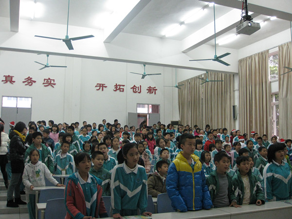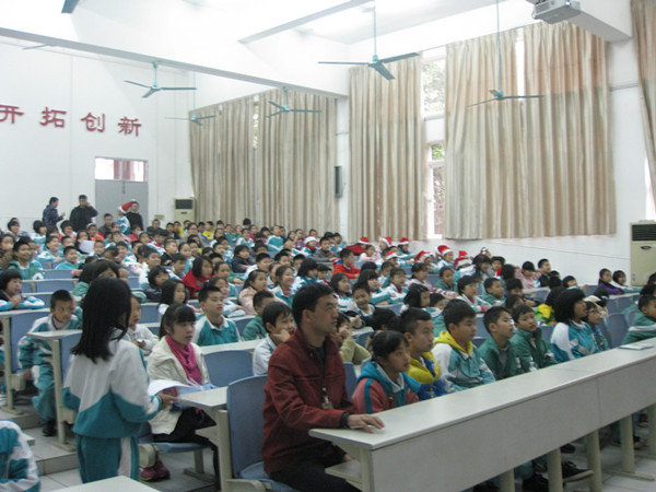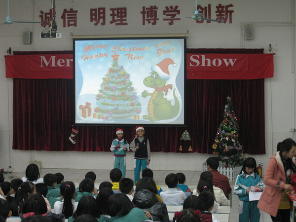 12月20日下午,一楼阶梯教室里洋溢着浓厚的圣诞节日气氛。小学四、五年级所有的学生以及英语老师沉浸在一片欢乐的海洋之中。这里正在举行一场主题为“快乐圣诞”的英语秀。