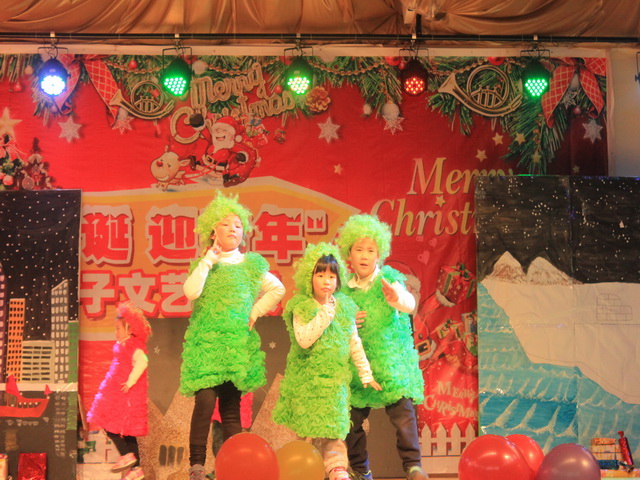 整个圣诞活动,以国际班全体小朋友进行游戏“开火车”的形式拉开了序幕,小朋友们的欢笑声顿时成了圣诞最美的音符。接下来就是小朋友和老师们的热身舞蹈《Go Santa Go》,让整个Party一下子热闹了起来。当家长们还沉浸在欢乐的音乐中时,一群打扮抢眼的小朋友走上了舞台,这就是让我们眼前一亮的英语话剧。小朋友们俏皮、可爱、夸张的表演得到了家长们的阵阵掌声。而接下来的歌曲表演和打击乐表演同样十分精彩,在场所有观众都忍不住和孩子们一起唱起了圣诞歌。