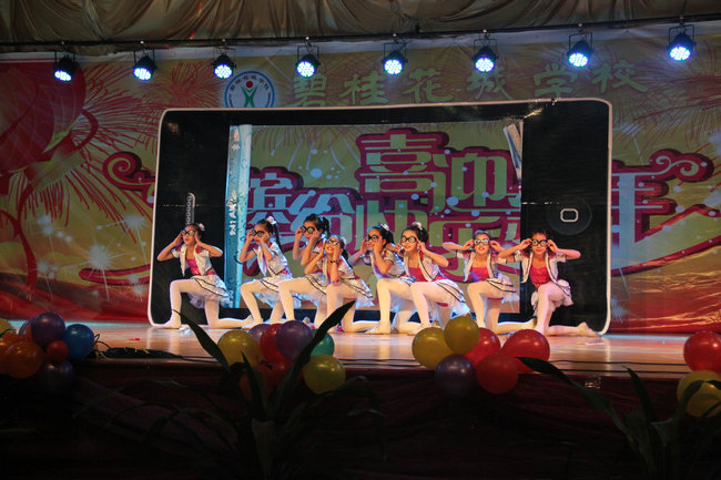 校舞蹈队的舞蹈更是一个比一个精彩,同学们的表演认真而纯真,节目的编排颇具匠心,道具的准备煞费苦心。无论是《诱惑》,还是《你是我的眼睛》,不再只是停留在动作整齐的层面上,而是每个舞蹈都有情节性,每个舞蹈都是无声的语言,通过肢体、表情、合作在向同学们讲故事,而效果又比讲故事更深入人心。《诱惑》反映生活实际,《吐气扬眉》改编童话,《你是我的眼睛》感人至深,同学们随着音乐的起伏时而报以热烈掌声,时而全场肃静,眼里闪烁着泪花。