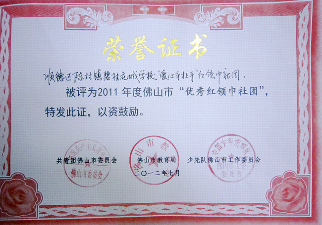 在共青团佛山市委员会、佛山市教育局、少先队佛山市工作委员会组织的少先队社团评比活动中,我校“爱心手拉手社团”被评为佛山市“优秀红领巾社团”,特此祝贺!