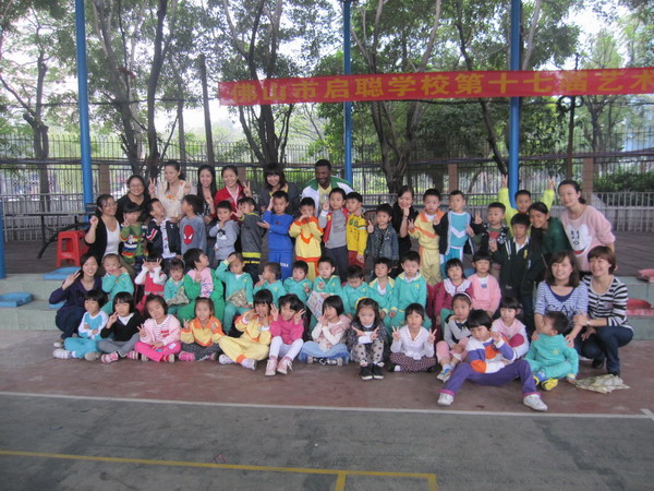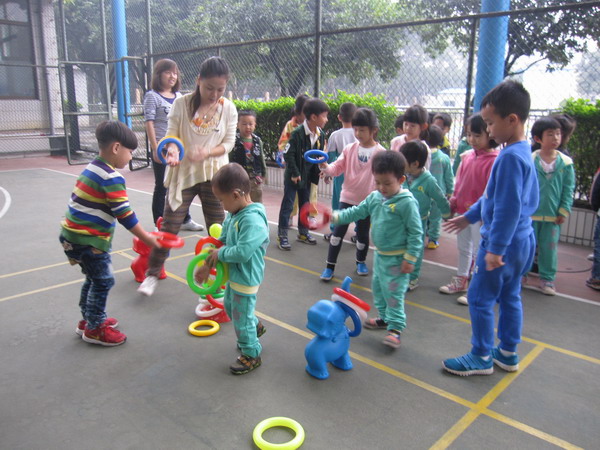 早上,为了表示我们的友好,我园孩子们手里拿着准备好的小礼物来到佛山市启聪学校,该校是一所听力障碍和智力障碍儿童青少年为教育对象的特殊教育学校。当我们见到智障康复班和语训班的18名幼儿时,他们是那么的热情跟我们打招呼。我们围成一个大圆圈坐下来相互表演了精彩的节目,还玩了抛圈圈、接力赛、投积木的体育游戏。在玩游戏时,因为其中有几个孩子是植入了人工耳蜗,所以国际大一班的孩子小心地拉起他们的手一起玩,一起跑,尽显他们对特殊儿童的照顾与关爱。之后我们还参观了他们的训练室,里面设备齐全,老师悉心地教育,相信这些特殊的孩子在这里会得到良好的康复。