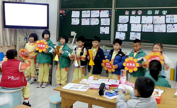最后的评价,真是别出心裁,老师制作了精美的金、银、铜奖杯,还有最佳合作奖、最佳创意奖、最佳造型奖、优秀奖等奖牌,所有获奖作品先由小组讨论,再进行投票产生奖项,课堂气氛再一次被推向高潮,看着孩子们那一张张兴奋、激动、自豪的笑脸,让在坐的来宾和家长都为之动容。