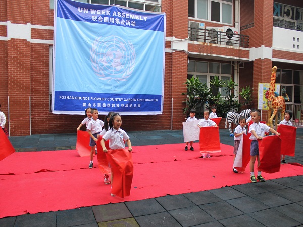 10月26日下午,幼儿园国际班的孩子们举行了“联合国周”的展示活动。参加这次“联合国”活动的有国际班的四个班级小朋友。首先出场的是维和部队,在“队长”Mr. James的带领着国际大一班和国际大二班部分孩子斗志昂扬地踏步入场。――“联合国”展示活动揭开序幕。