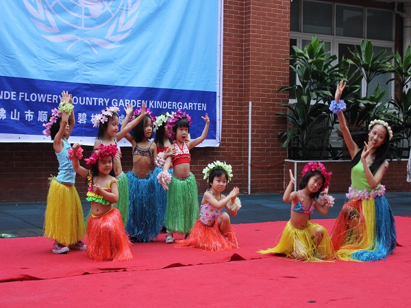 看见了弟弟妹妹精彩表演,国际中班的孩子们也拿出了自己的“绝活”――他们代表的是美洲,一群可爱的孩子们穿着草裙跳起了火辣辣的夏威夷草裙舞,还有酷酷的巴西足球秀及啦啦操表演,真是太棒了!