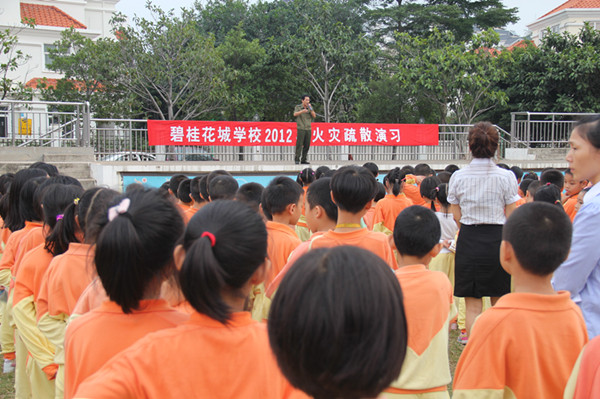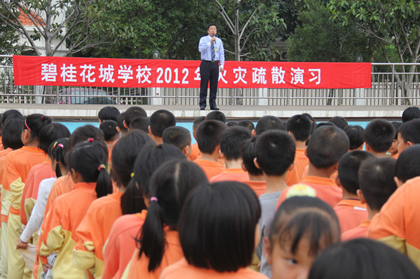 我校对学生安全自救教育非常重视, 11月9号是全国“安全消防日”,那一天,我校举行了“火灾疏散演习”。下午4:20,广播响起了,大家听到“火灾疏散演习现在开始”的口令,学生在老师的带领下,沿预定路线迅速撤离到足球场。大家都用湿毛巾捂住口鼻,弯着腰,快步疾行,不到2分10秒,全校师生都安全到达指定位置。