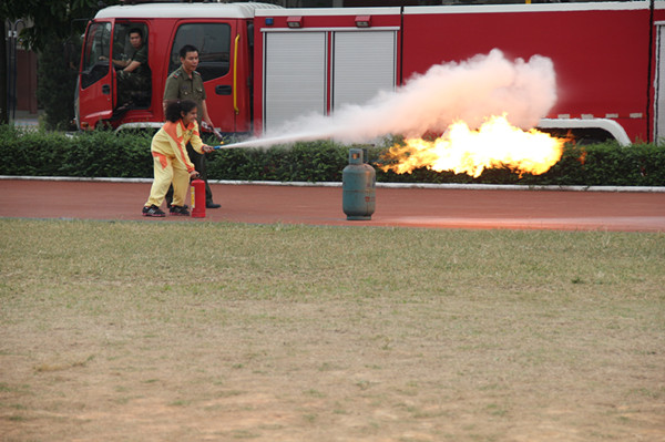 接着,陈村消防中队警官给大家讲话,教育学生们要增强预防火灾的意识,了解日常生活中防火灭火知识,掌握火灾发生时逃生的基本技能。他的讲话迎来了同学们热烈的掌声。陈村消防官兵们还为同学们演示了如何使用灭火器。少数同学在警官的指导下也参与了使用灭火器灭火。最后,官兵们给大家表演了高空灭火,只见消防车上的水管喷出高达10几米的水柱,操场上又爆发出一阵阵热烈的掌声。