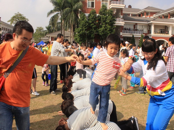 精彩的团体操表演过后,小班、小小班的孩子们开始了激烈、好玩的亲子竞赛游戏,只见这边家长们手拉着手,把孩子们从这头传到那头;那边家长们又一个个连成一片趴在草地上,形成一条“背桥”,让孩子们从自己的背上踩过去,富有创意且不乏挑战性,场上的选手们争分夺秒认真比赛,场下的啦啦队热情鼓舞欢呼呐喊,趣味十足的亲子游戏,幽默诙谐的动作让人忍俊不禁,比赛环节一个接着一个,加油声、呐喊声、欢呼声沸腾了整个运动场。