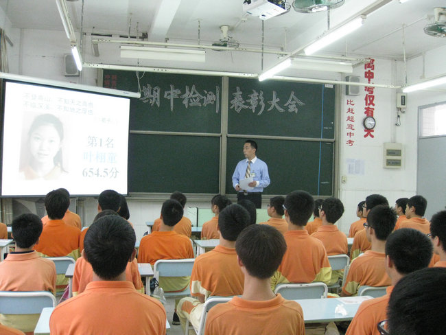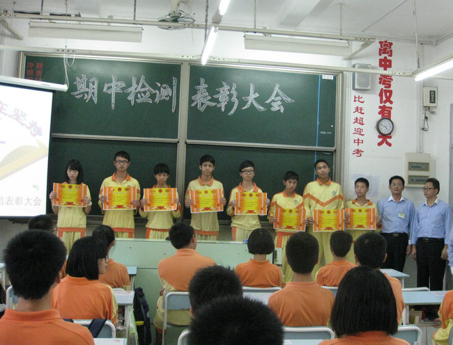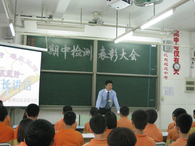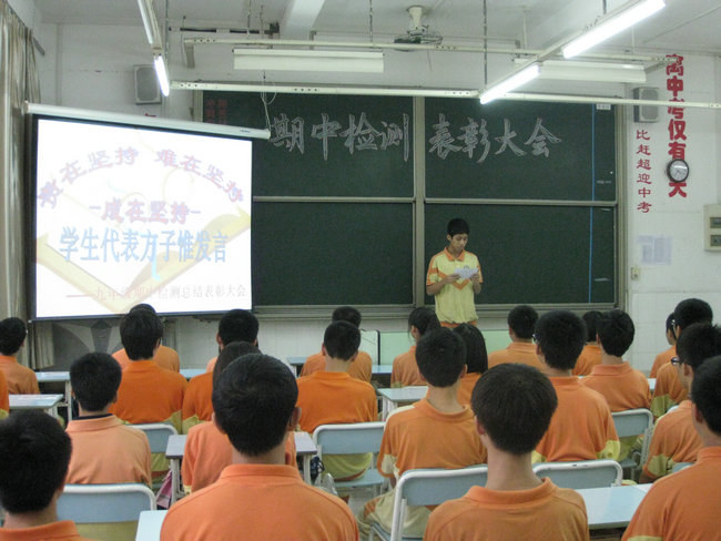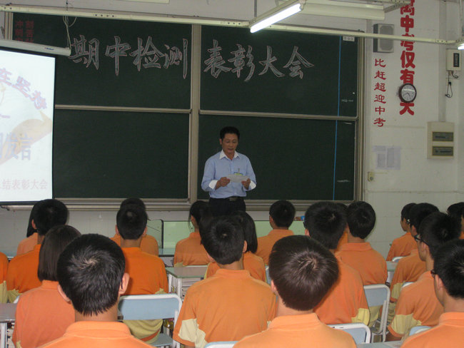 10月16日下午4:20,我校九年级全体师生聚集在九(2)班教室里,举行了一场振奋人心的期中考试表彰大会。这次大会的主题是“贵在坚持、难在坚持、成在坚持”,年级组长代天良老师主持了大会,贺校长也应邀出席。