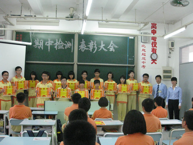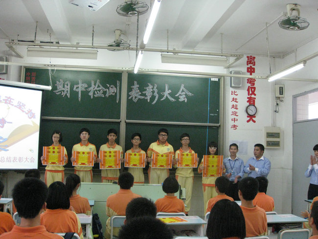 大会在欢快的乐曲中为期中检测获奖的同学颁奖,同学们都报以阵阵热烈的掌声。