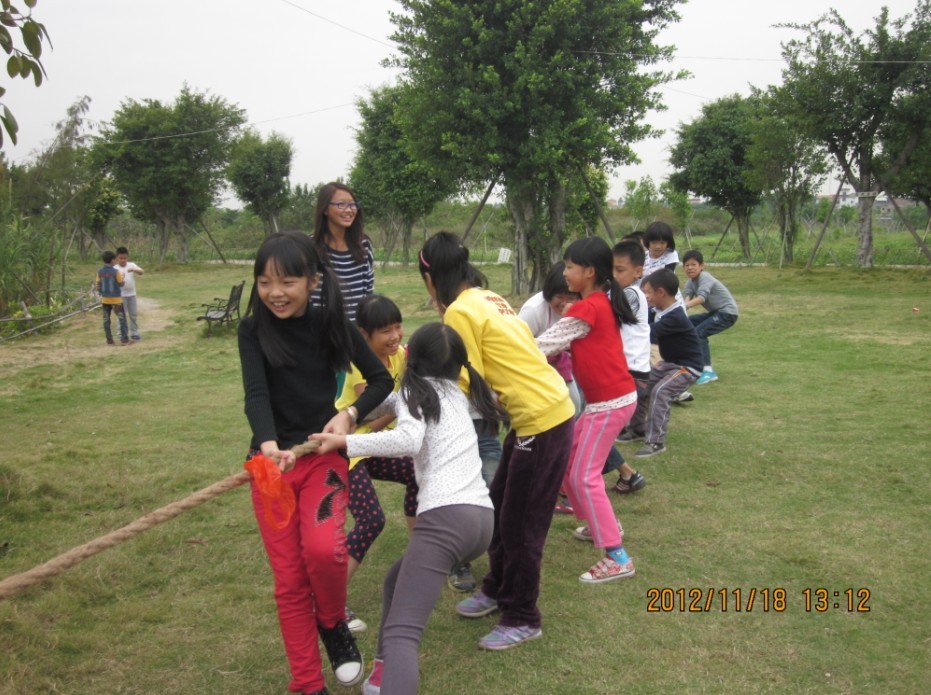 现在,是十几位妈妈和老师对我们了,我们大力拉绳,妈妈们老师们个个体力不支,倒下了。哦!赢啦!