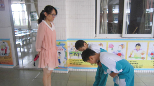 瞧,经过一段时间的努力,学生渐渐能做到:见到老师和客人主动用英语问好并鞠躬行礼;衣着整洁,仪表端庄;不说粗话,不给同学起绰号;团结同学,不吵嘴打架;进老师办公室要用英语喊报告。课间活动不追逐打闹;不大声喊叫;不玩危险性游戏;上下楼梯轻声慢步靠右行。