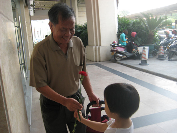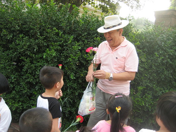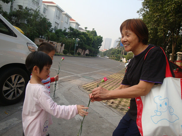 出发啦!孩子们手里拿着康乃馨,脸上洋溢着喜悦的心情,手牵手唱着歌谣走进社区。见到爷爷奶奶们,孩子们亲切地叫着:“爷爷奶奶好。”然后分别把鲜花送给他们,以此表达心中的敬意。瞧,孩子们还不忘跟爷爷奶奶说:“祝爷爷奶奶重阳节快乐,身体健康!”爷爷奶奶双手接过鲜花,脸上乐开了花,有的奶奶还蹲下来抱抱孩子们表示感谢。孩子们得到了爷爷奶奶的表扬,心里乐滋滋的。