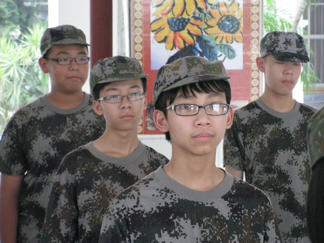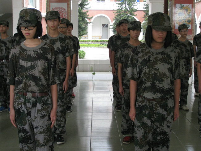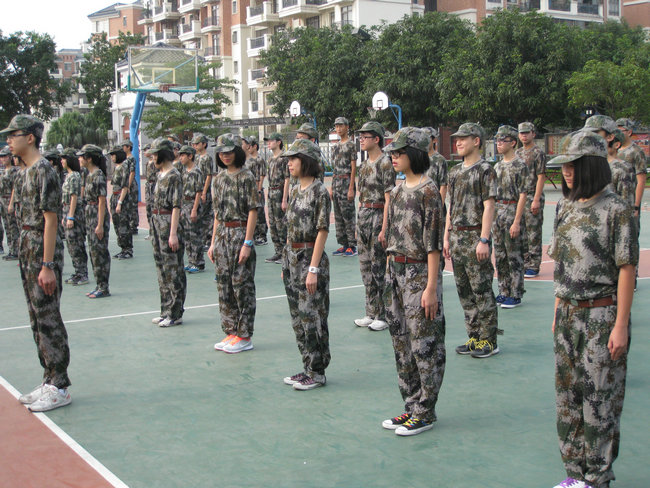 在操场上,我们穿着军装,个个精神抖擞。在火辣的烈日下,我们笔直地在站军姿,汗水一滴一滴地往下流,布满整个额头,肩膀站地酸痛,全身都好像有小虫在咬,但我们一动都不能动。