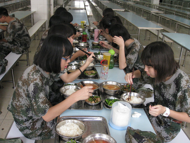 一大清早,朱老师就叫“起床啦,军训啦!”迅速换好军装,吃完早餐后,我们就集队了。不过在那之前,几乎每个同学都要先抹上厚厚的一层防晒霜。