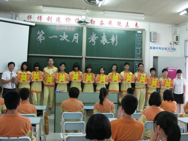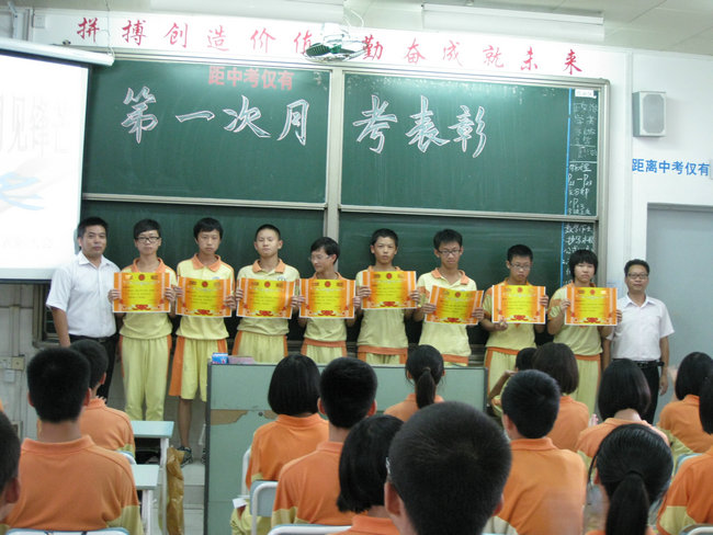 这次月考中,彭婷等12名同学总分名列前茅,甘宇骏等7名同学分别夺得各学科第一名,黎诗琪等八名同学取得很大进步。在热烈的掌声中,老师们为他们一一颁奖,并祝愿他们再接再厉,再攀新高!学生代表叶栩童同学结合自身体会谈了学习方法,号召同学们在学习的道路上勇敢的战胜挫折,永不言弃。