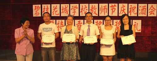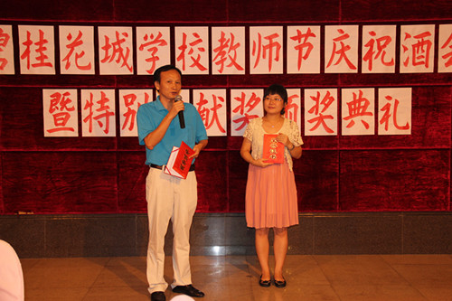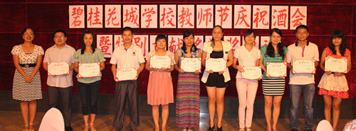9月9日晚6时,顺德碧桂园豪园会所灯火辉煌,鲜花与彩带把餐厅装饰得格外喜庆。碧桂花城学校全体教职工欢聚一堂,在这里举行庆祝教师节酒会暨特别贡献奖颁奖典礼。负责碧桂园连锁学校工作的梁校监出席了酒会,并和学校领导一起向全体教职工表达亲切的问候和良好的祝愿!